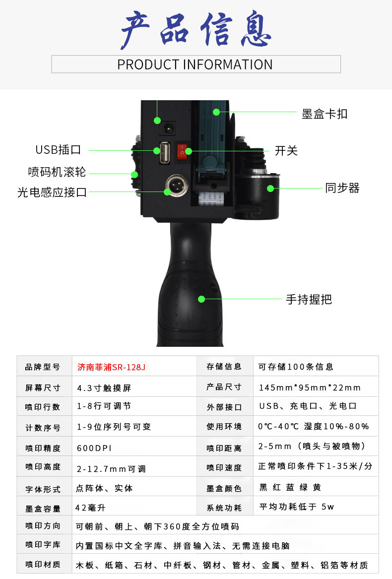 濟南菲浦SR-128J手持噴碼機技術(shù)參數(shù)